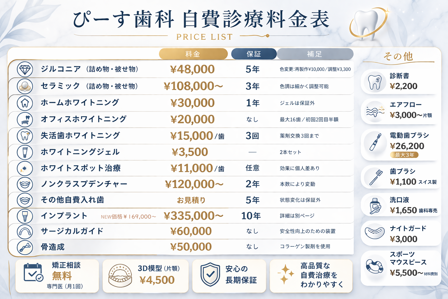 | ジルコニア詰め物・かぶせ物 | ¥48.000 | 初回製作より 5年 | ジルコニアは見本と完成物,お口の中で見え方がイメージ通りでない場合もあります.再製作による色変更は¥10.000焼き付けによる色変更¥3.300で承っております. |